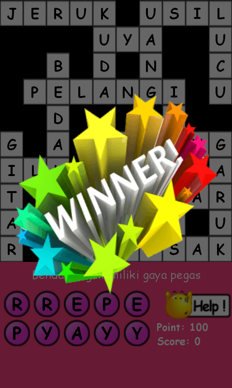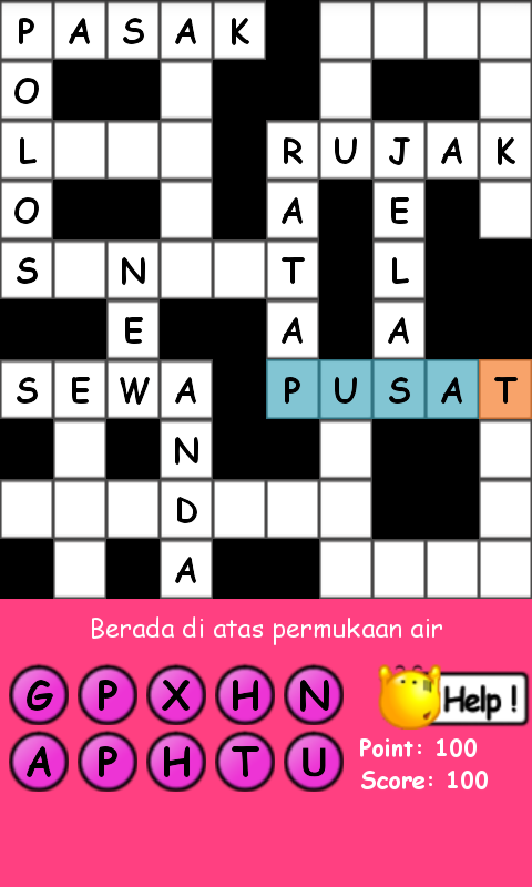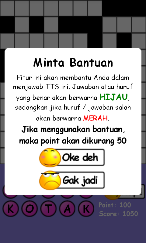 Game teka teki silang (TTS) ini dapat kamu mainkan di smartphone yang berbasis Android. Game asah otak ini dirancang agar dapat dinikmati oleh banyak orang karena soal-soalnya dibuat semudah mungkin, jadi kamu tidak akan terlalu kesulitan untuk mengisi kotak-kotak putih. Namun jika kamu masih kesulitan juga, tenang saja. Saking baiknya game android ini, jika kamu kesulitan kamu akan diberikan fitur bantuan (Help) sehingga tak ada kata "SUSAH" lagi dalam game permainan kata-kata ini.